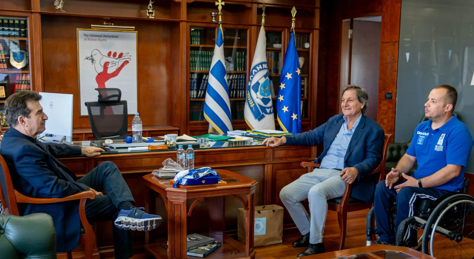 Ο κ. Καλούδης, εκπροσωπώντας το Διοικητικό Συμβούλιο της ΟΣΕΚΑ, μαζί με τον καλαθοσφαιριστή του Α.Σ. ΑΤΛΑΣ και της Εθνικής Ομάδας μπάσκετ με Αμαξίδιο, Αρμάντ Μίνα επισκέφθηκαν τον κ. Υπουργό, προκειμένου να τον ανακηρύξουν σε «Πρεσβευτή Καλής Θέλησης για την καλαθοσφαίριση με αμαξίδιο», τη μέγιστη τιμή της Ομοσπονδίας σε άτομα με σπουδαία προσφορά.