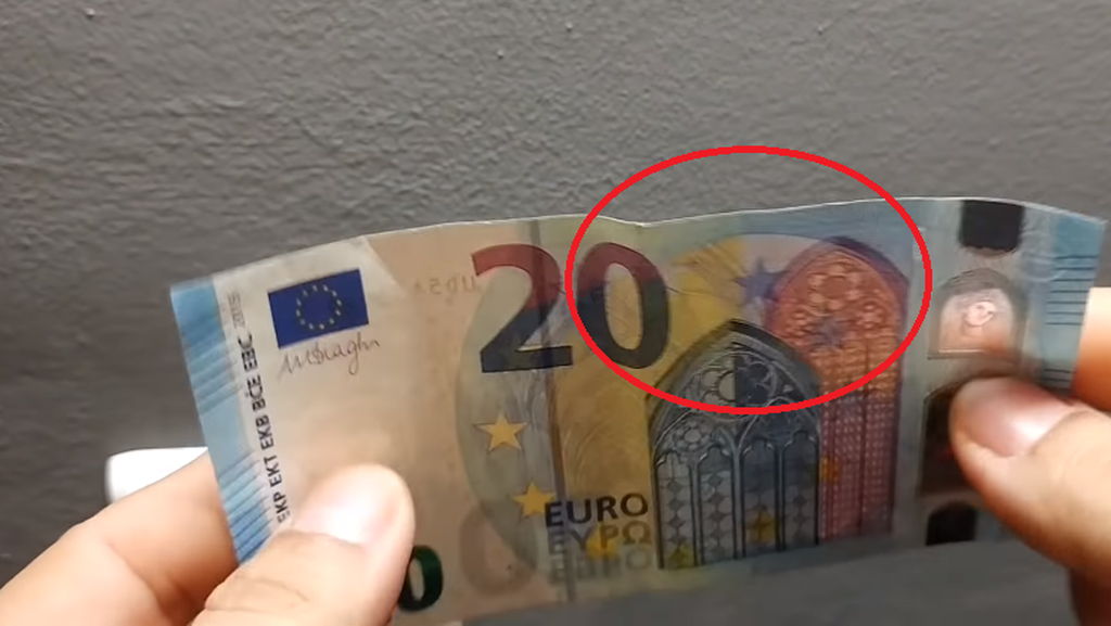 Όταν κοιτάτε το χαρτονόμισμα κόντρα στο φως, θα πρέπει να εμφανιστεί η εικόνα της Ευρώπης και η ονομαστική αξία του χαρτονομίσματος.