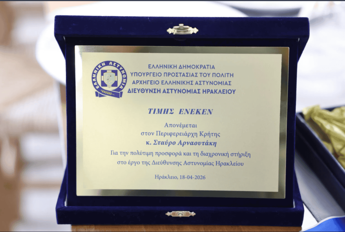 Πραγματοποιήθηκαν το Σάββατο 18 Απριλίου 2026, τα εγκαίνια της νέας Λέσχης σίτισης των ενστόλων στο Αστυνομικό Μέγαρο Ηρακλείου, παρουσία του Υπουργού Προστασίας του Πολίτη Μιχάλη Χρυσοχοΐδη και του Περιφερειάρχη Κρήτης Σταύρου Αρναουτάκη.