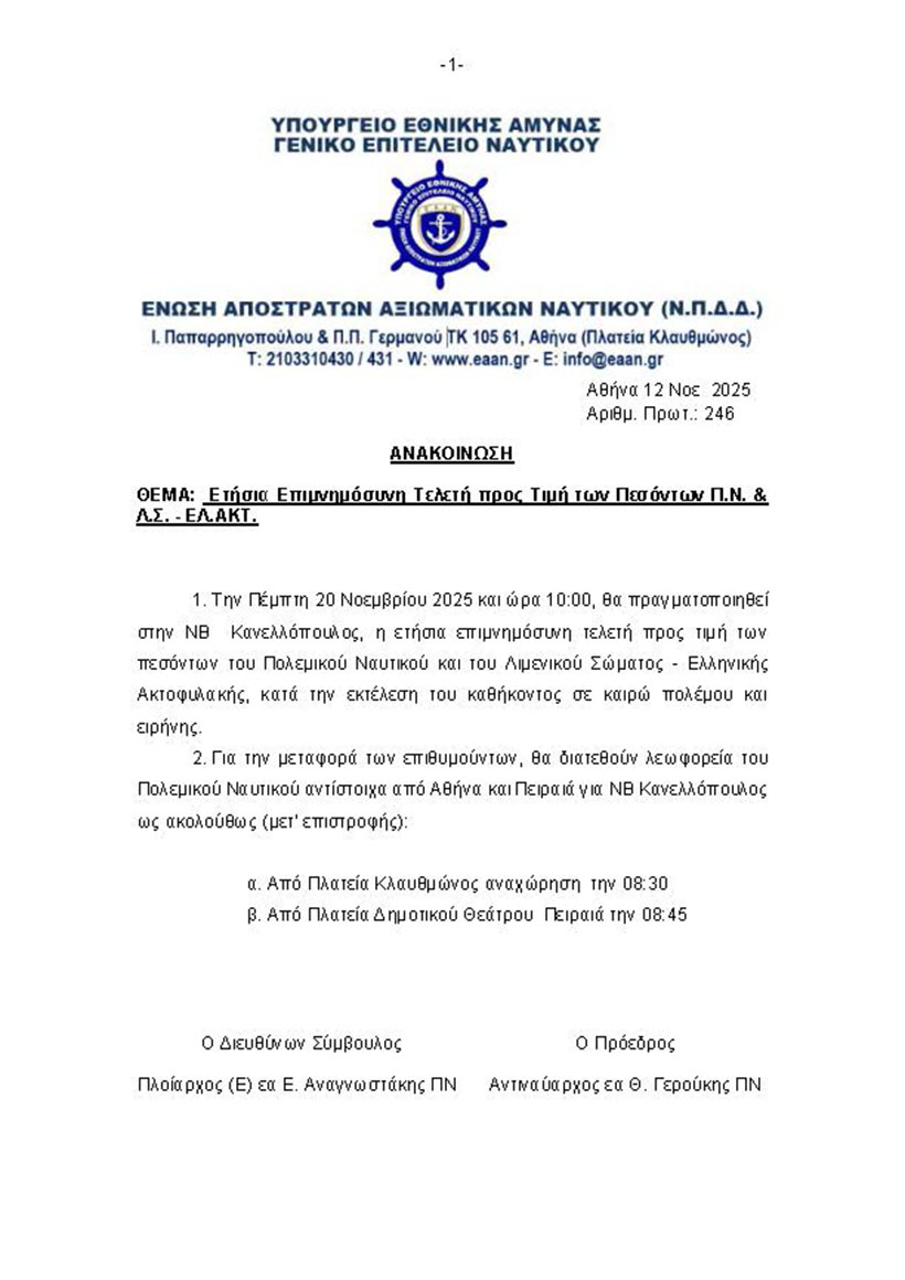 Ετήσιο Μνημόσυνο προς Τιμή των Πεσόντων ΠΝ & ΛΣ-ΕΛ.ΑΚΤ στη ΝΒ Κανελλόπουλος