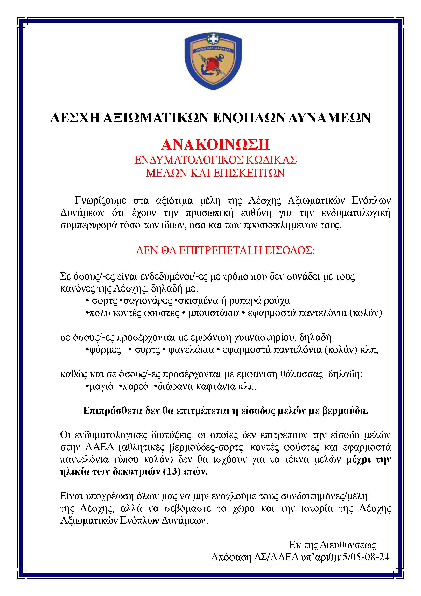ΛΑΕΔ – Ενδυματολογικός κώδικας μελών και επισκεπτών