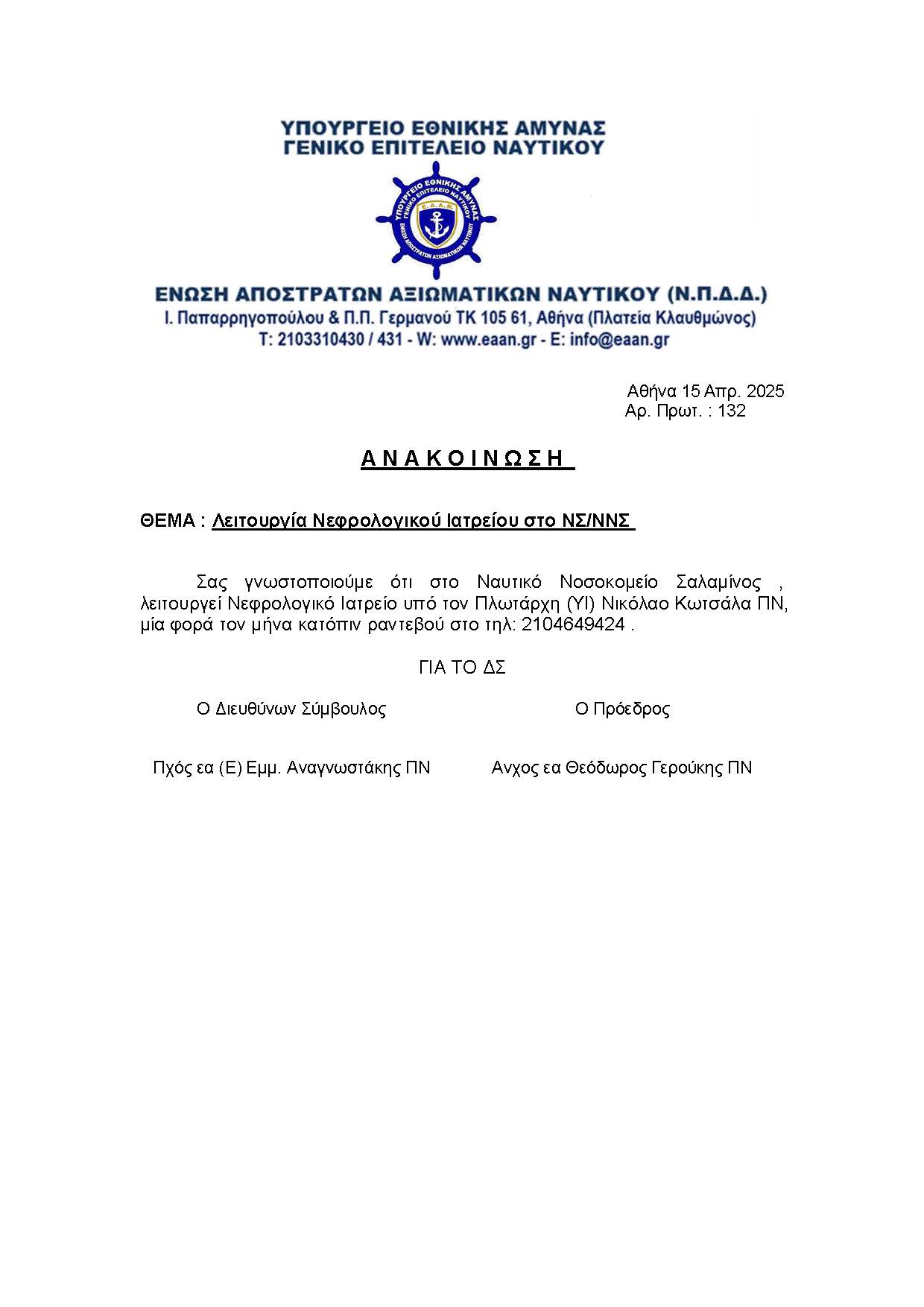 Λειτουργία Νεφρολογικού Ιατρείου στο ΝΣ/ΝΝΣ