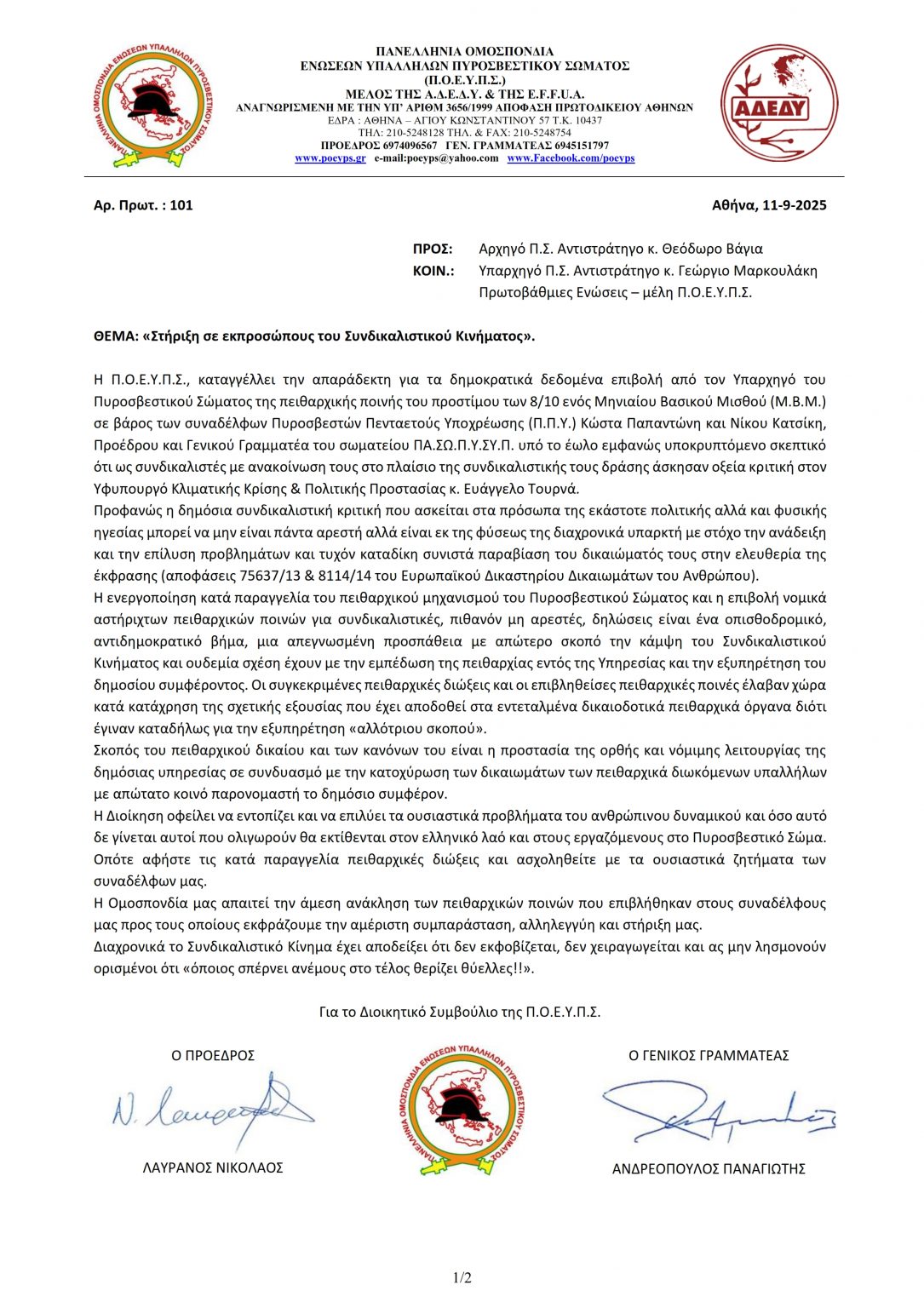 Π.Ο.Ε.Υ.Π.Σ.: Στήριξη σε εκπροσώπους του Συνδικαλιστικού Κινήματος