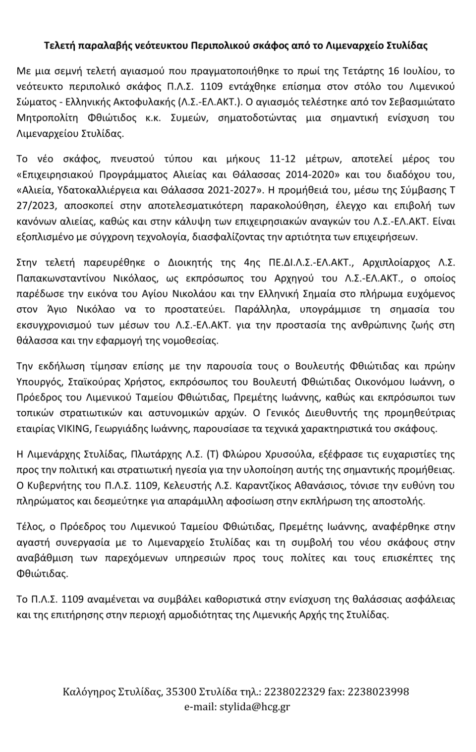 Τελετή παραλαβής νεότευκτου περιπολικού σκάφους από το Λιμεναρχείο Στυλίδας