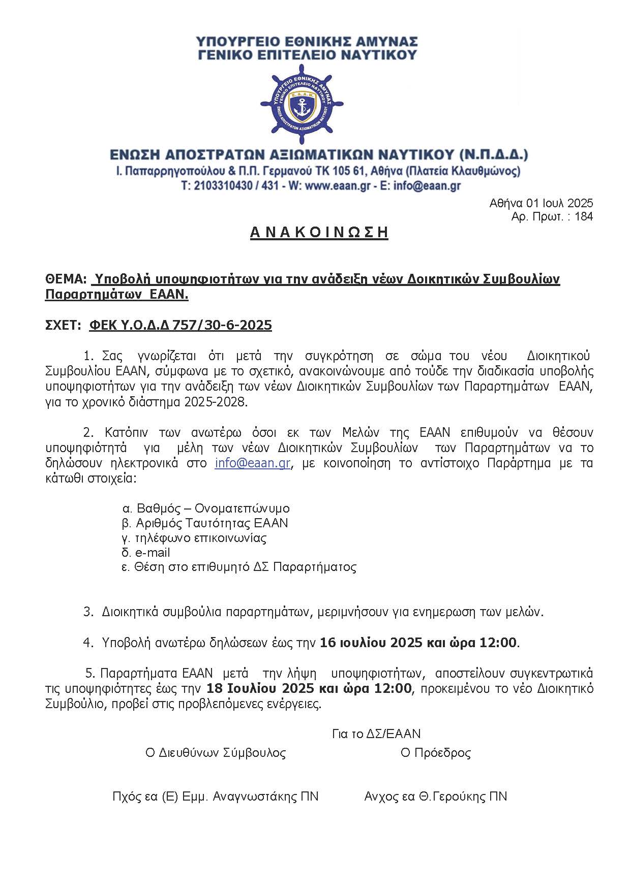Υποβολή υποψηφιοτήτων για την ανάδειξη νέων Διοικητικών Συμβουλίων Παραρτημάτων ΕΑΑΝ