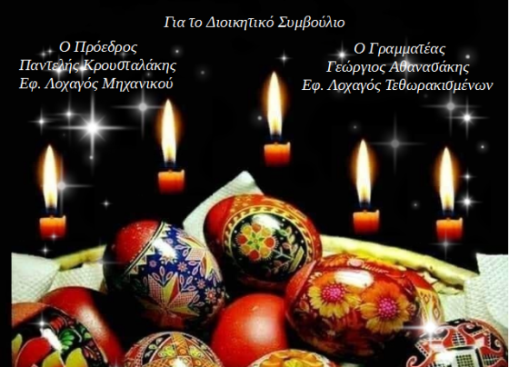 Ο Πρόεδρος και το Διοικητικό Συμβούλιο του Συνδέσμου Εφέδρων Αξιωματικών Ν. Ηρακλείου, ενόψει του Πάσχα, στέλνουν τις ευχές τους σε…