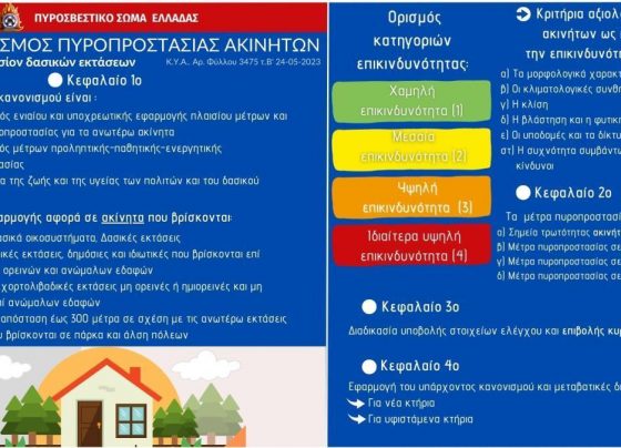 Μπορείτε να διαβάσετε αναλυτικά την Κ.Υ.Α. Περί Κανονισμού Πυροπροστασίας ακινήτων εντός ή πλησίoν δασικών εκτάσεων  Αρ. Φύλλου 3475 τ.Β’ 24-05-2023 ΕΔΩ Μπορείτε να διαβάσετε αναλυτικά την από…