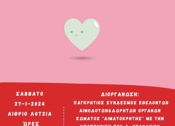 Εθελοντική αιμοδοσία θα πραγματοποιηθεί το Σάββατο 27/01/2024 στο κέντρο της πόλης του Ηρακλείου και συγκεκριμένα στο αίθριο της Λότζια από…