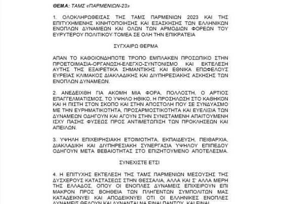 Συγχαρητήρια Αρχηγού ΓΕΕΘΑ στο Προσωπικό των Ενόπλων Δυνάμεων για την Επιτυχή Ολοκλήρωση της ΤΑΜΣ «ΠΑΡΜΕΝΙΩΝ – 23»