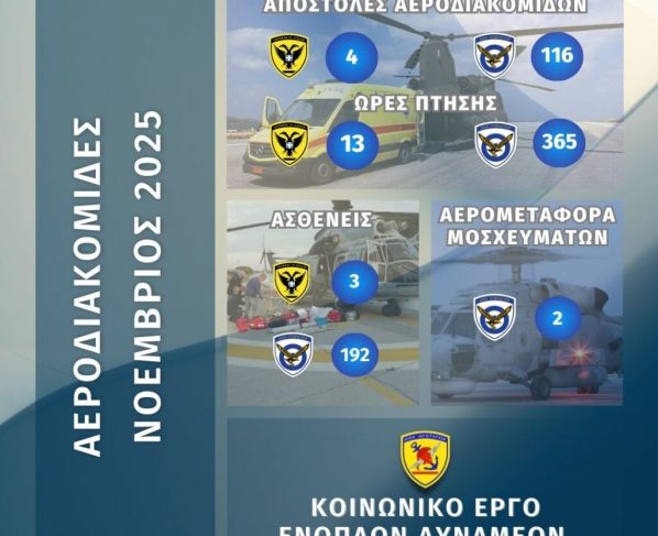 Infographic με τη Συνδρομή των Ενόπλων Δυνάμεων σε Αεροδιακομιδές για τον μήνα Νοέμβριο 2025.