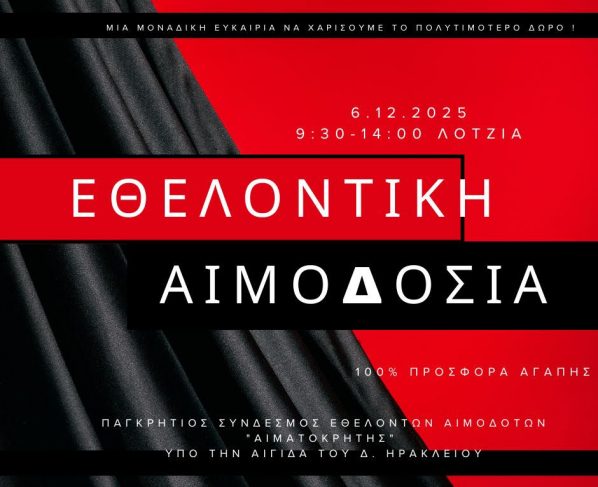 Το Σάββατο 6 Δεκεμβρίου 2025 θα πραγματοποιηθεί εθελοντική αιμοδοσία στο κέντρο της πόλης του Ηρακλείου και συγκεκριμένα στο αίθριο της Λότζια από τις 09:30 έως τις 14:00. Η εθελοντική αιμοδοσία…