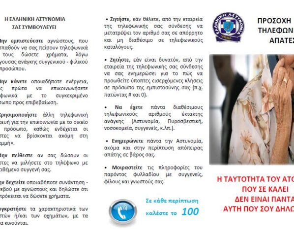 Με αφορμή περιστατικά εξαπάτησης πολιτών, σε διάφορες περιοχές της χώρας, από επιτήδειους που προσεγγίζουν κυρίως άτομα τρίτης ηλικίας και με διάφορα προσχήματα και τεχνάσματα τους αποσπούν χρηματικά ποσά, η Ελληνική…