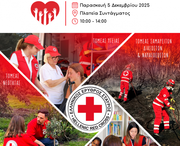 Ο Ελληνικός Ερυθρός Σταυρός τιμά την Παγκόσμια Ημέρα Εθελοντισμού διοργανώνοντας μεγάλη εορταστική εκδήλωση στην Πλατεία Συντάγματος την Παρασκευή 5 Δεκεμβρίου 2025 και ώρες 10:00 – 14:00, με κεντρικό θέμα: «Γίνε…