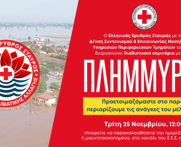 Ο Ελληνικός Ερυθρός Σταυρός (Ε.Ε.Σ.), στο πλαίσιο υλοποίησης της Στρατηγικής Κλιματικής Αλλαγής του Ε.Ε.Σ., διοργανώνει σήμερα Τρίτη 25 Νοεμβρίου 2025 και ώρα 12:00 μ.μ. διαδικτυακό σεμινάριο με θέμα: «Πλημμύρες: Προετοιμαζόμαστε στο παρόν, περιορίζουμε…