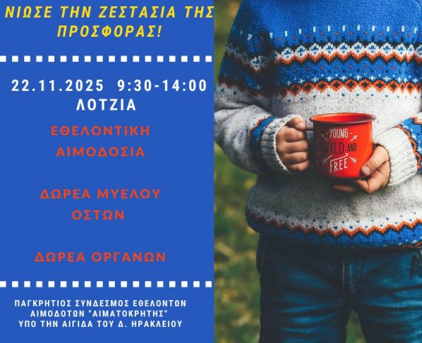 Το Σάββατο 22 Νοεμβρίου 2025 θα πραγματοποιηθεί εθελοντική αιμοδοσία στο κέντρο της πόλης του Ηρακλείου και συγκεκριμένα στο αίθριο της Λότζια από τις 09:30 έως τις 14:00. Η εθελοντική αιμοδοσία…