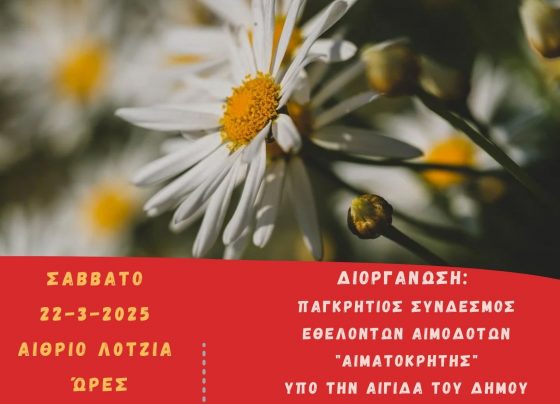 Το Σάββατο 22 Μαρτίου 2025 θα πραγματοποιηθεί εθελοντική αιμοδοσία στο κέντρο της πόλης του Ηρακλείου και συγκεκριμένα στο αίθριο της…