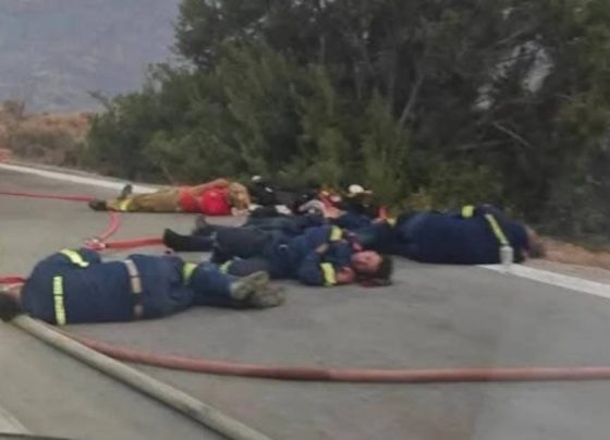 Συγκλονίζει η φωτογραφία πυροσβεστών από τη Χίο: Εξουθενωμένοι, ξεκουράζονται στον δρόμο