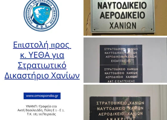 Π.Ο.Λ.: Επιστολή προς κ. ΥΕΘΑ για Στρατιωτικό Δικαστήριο Χανίων