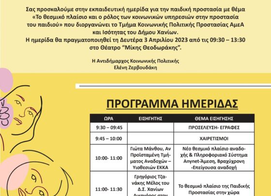 Ο Δήμος Χανίων και η Κοινωφελής του Επιχείρηση Πολιτισμού και Περιβάλλοντος (Κ.Ε.Π.ΠΕ.ΔΗ.Χ.-Κ.Α.Μ.) διοργανώνουν, εκπαιδευτική ημερίδα για την παιδική προστασία  με θέμα: «Το θεσμικό πλαίσιο και ο…