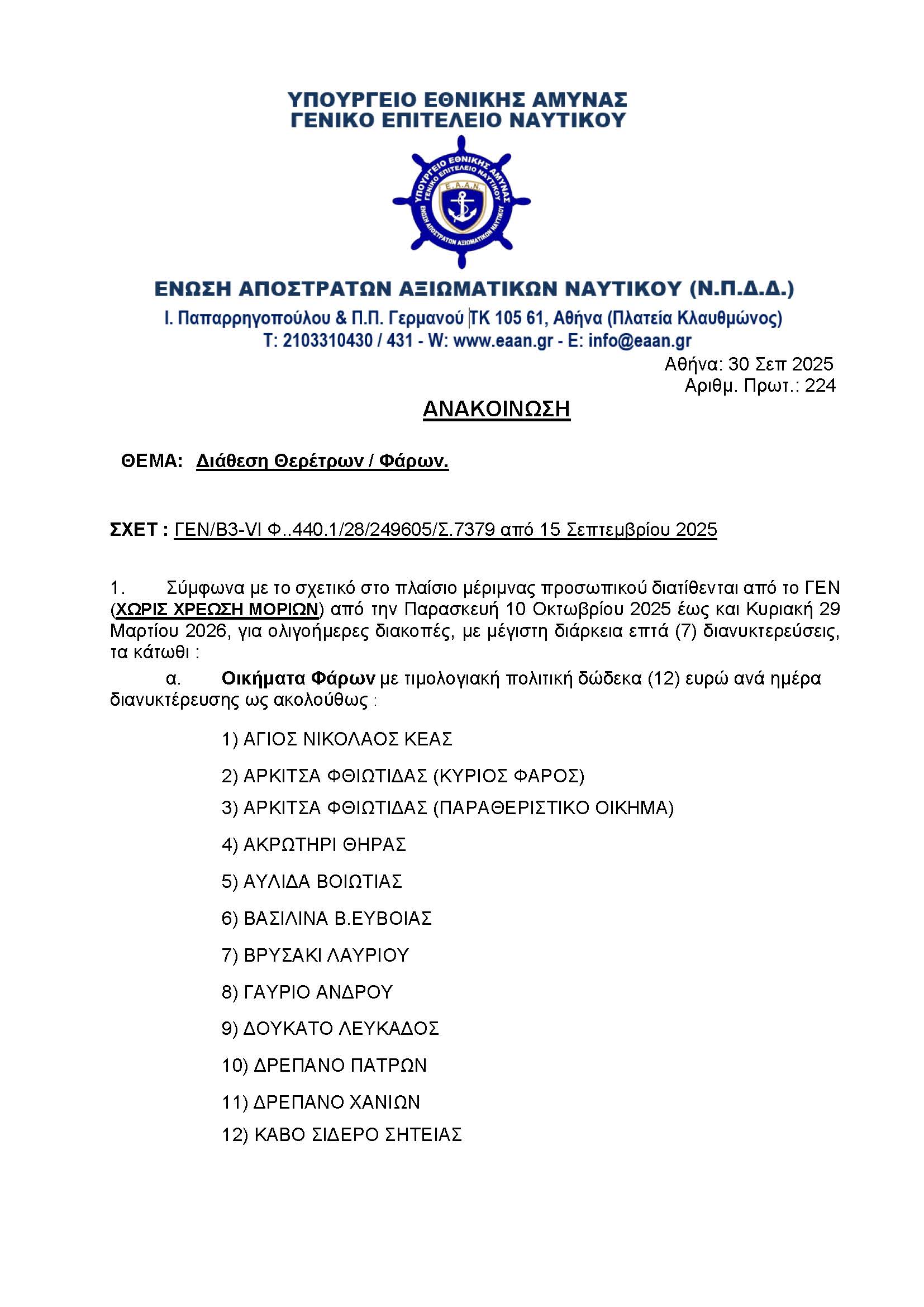 EAAN: Διάθεση Θερέτρων και Φάρων από 10.10.25 έως 29.03.26