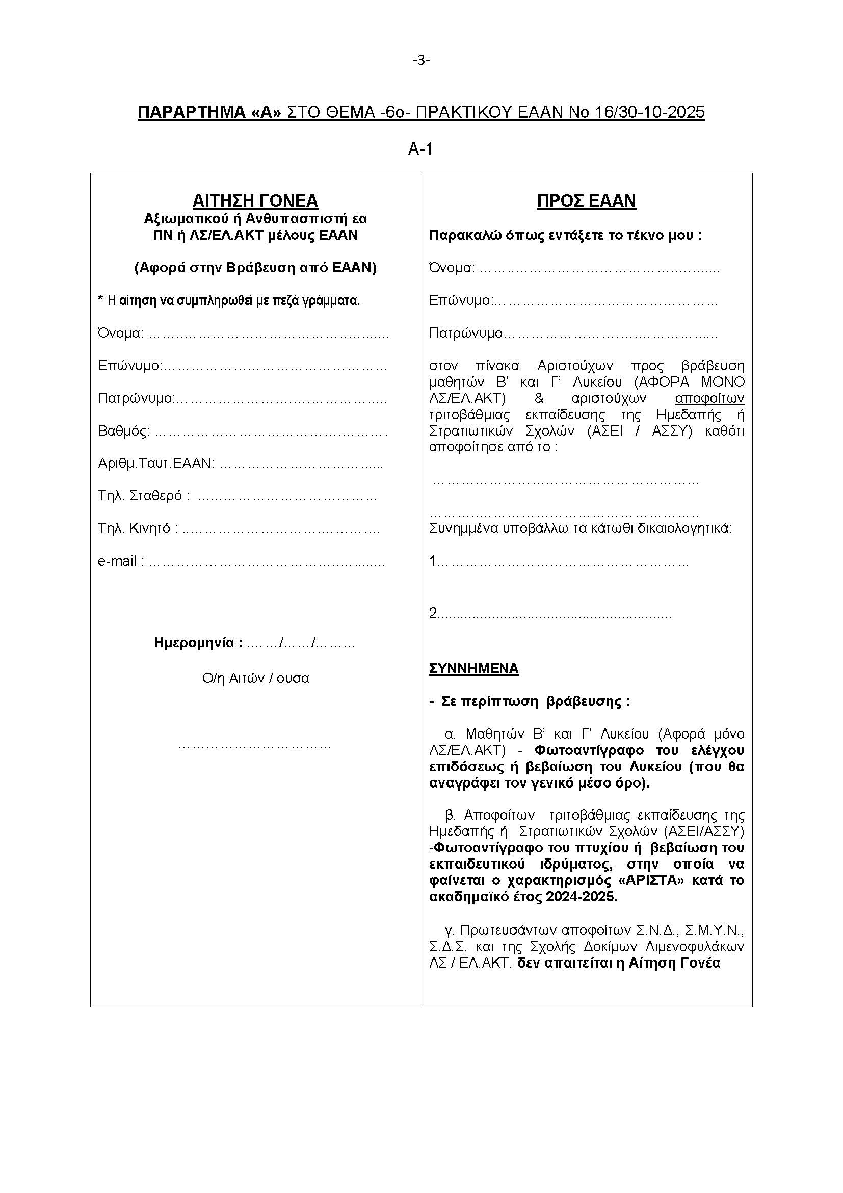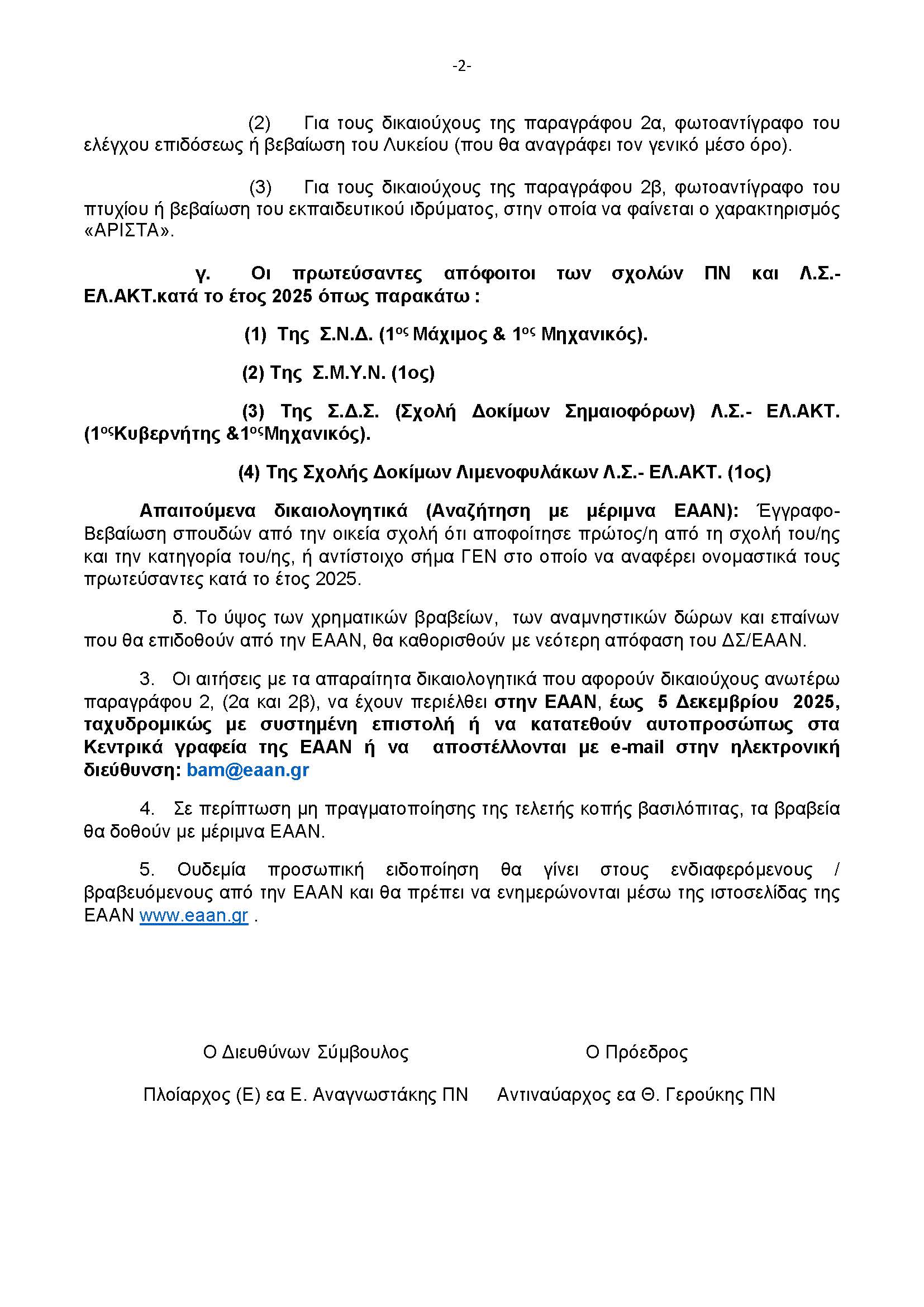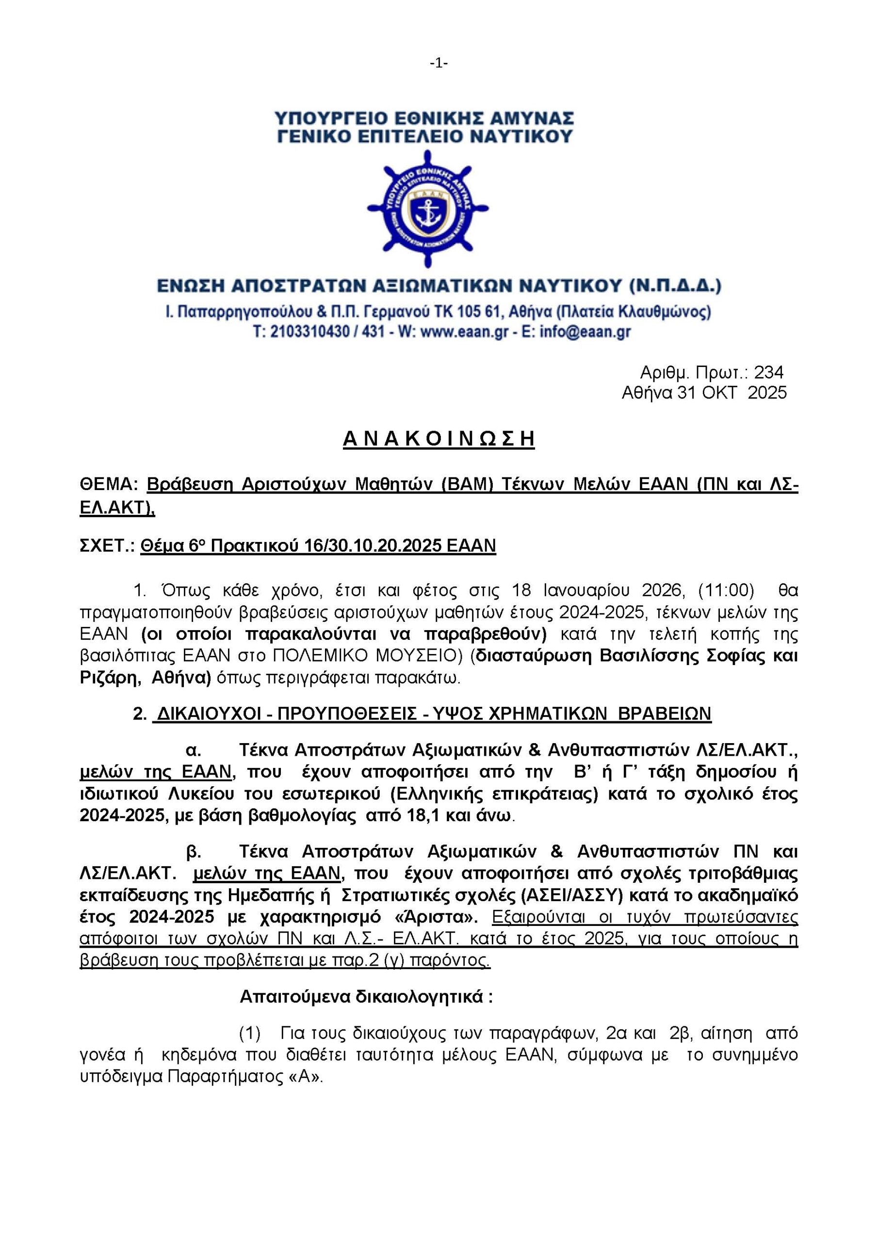 Βράβευση Αριστούχων Μαθητών (ΒΑΜ) Τέκνων Μελών ΕΑΑΝ (ΠΝ και ΛΣ-ΕΛ.ΑΚΤ) από ΕΑΑΝ