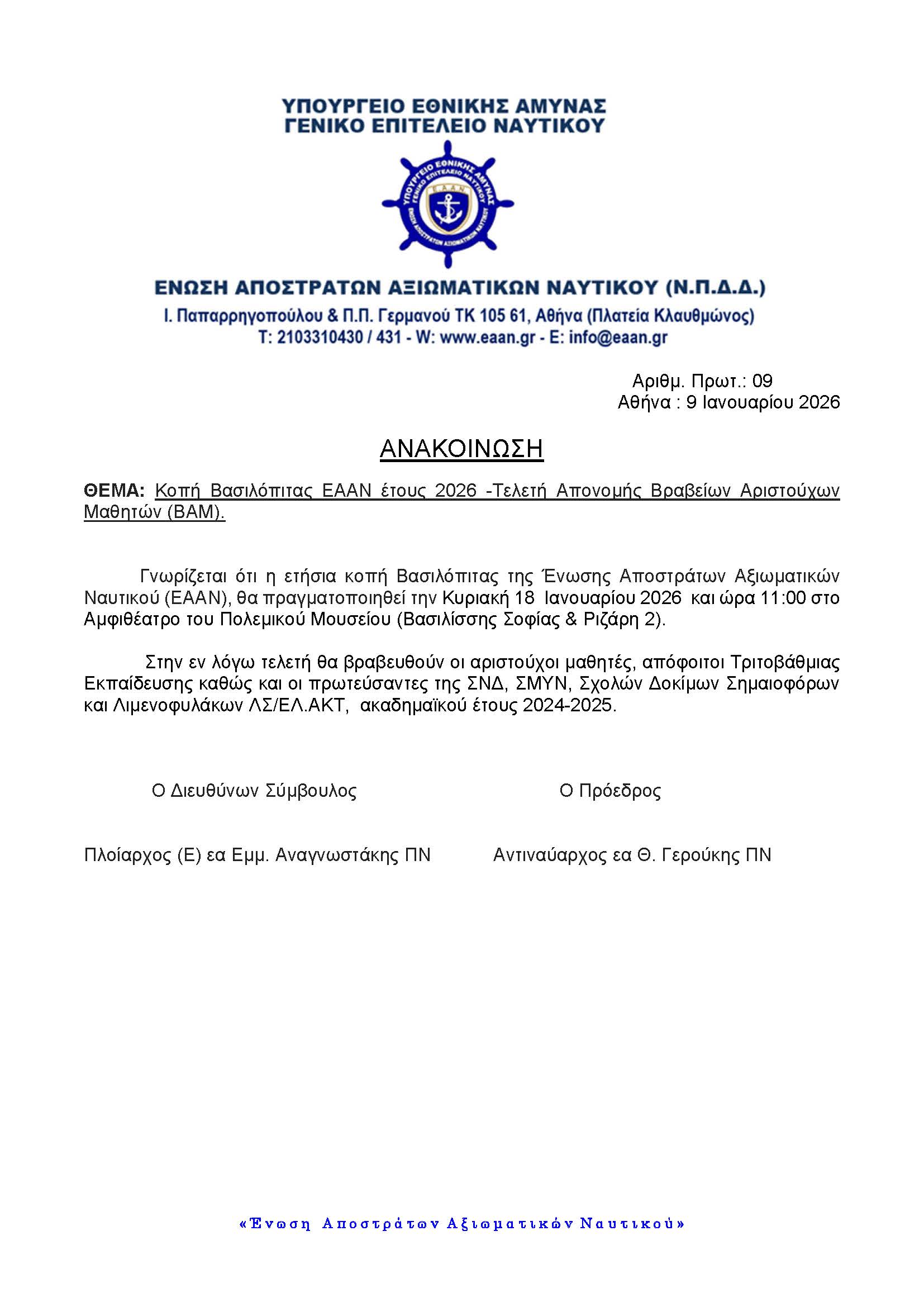 Κοπή Βασιλόπιτας ΕΑΑΝ έτους 2026 -Τελετή Απονομής Βραβείων Αριστούχων Μαθητών (ΒΑΜ)