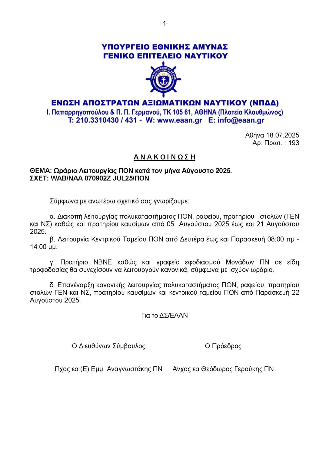 Ωράριο Λειτουργίας ΠΟΝ κατά τον μήνα Αύγουστο 2025