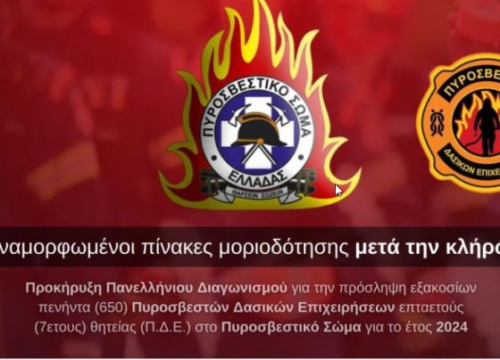 Κοινοποιούνται οι αναμορφωμένοι πίνακες μοριοδότησης μετά την κλήρωση για την πρόσληψη εξακοσίων πενήντα (650) Πυροσβεστών Δασικών Επιχειρήσεων επταετούς (7ετους) θητείας (Π.Δ.Ε.) στο…