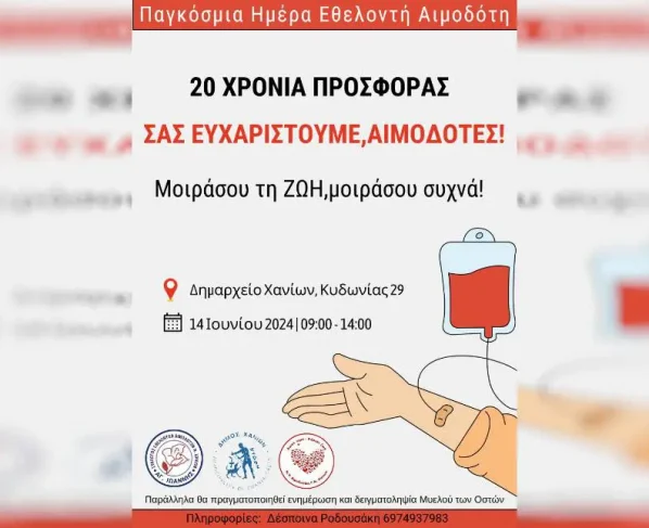 Εθελοντική αιμοδοσία στο Δημαρχείο Χανίων για τα 20 χρόνια εορτασμού της Παγκόσμιας Ημέρας Εθελοντή Αιμοδότη