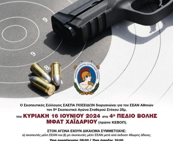 Ο Σκοπευτικός Σύλλογος ΣΑΣΠΑ ΠΟΣΕΙΔΩΝ διοργανώνει τον 5ο Σκοπευτικό Αγώνα ΣΕΑΝ Αθηνών Σταθερού Στόχου 25μ.