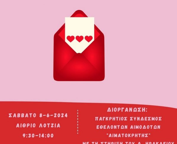 Το Σάββατο 08/06/2024 και θα πραγματοποιηθεί εθελοντική αιμοδοσία στο κέντρο της πόλης του Ηρακλείου και συγκεκριμένα στο αίθριο της Λότζια από τις 9:30 έως τις 14:00. Η εθελοντική αιμοδοσία πραγματοποιείται…
