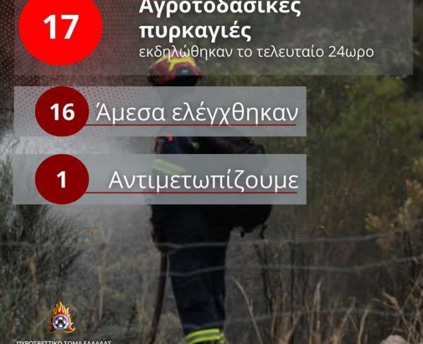 Από Ω/18:00/29-05-2024 έως Ω/18:00/30-05-2024 εκδηλώθηκαν 17 αγροτοδασικές πυρκαγιές, από τις οποίες οι 16 αντιμετωπίστηκαν άμεσα, στο αρχικό τους στάδιο, ενώ οι πυροσβεστικές δυνάμεις αντιμετωπίζουν ακόμη μία (1). Τα κατά τόπους ανακριτικά γραφεία, καθώς και Κλιμάκια…
