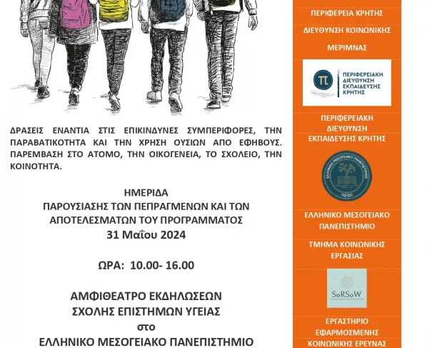 Tην παραβατικότητα και τη χρήση ουσιών από εφήβους. Παρέμβαση στο άτομο, την οικογένεια, το σχολείο, την κοινότητα Ημερίδα οργανώνει η Περιφέρεια Κρήτης όπου θα παρουσιαστούν τα αποτελέσματα του προγράμματος «Δράσεις…