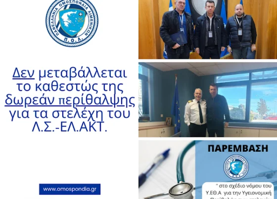 Π.Ο.Λ.: Δεν μεταβάλλεται το καθεστώς της δωρεάν περίθαλψης για τα στελέχη του Λ.Σ.-ΕΛ.ΑΚΤ.