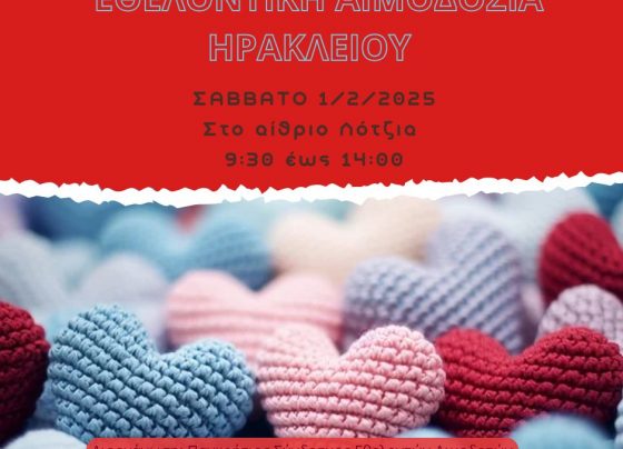Το Σάββατο 1 Φεβρουαρίου 2025 θα πραγματοποιηθεί εθελοντική αιμοδοσία στο κέντρο της πόλης του Ηρακλείου και συγκεκριμένα στο αίθριο της…