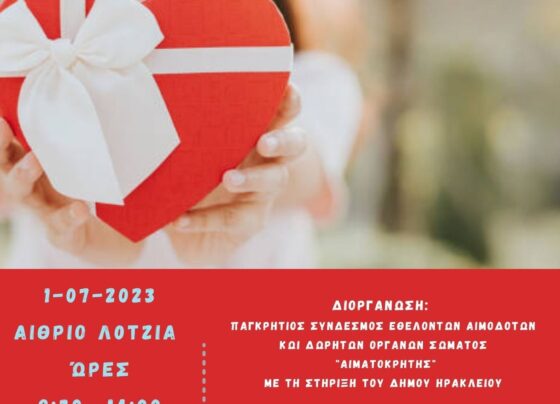 Εθελοντική αιμοδοσία θα πραγματοποιηθεί το Σάββατο 01/07/2023 στο κέντρο της πόλης του Ηρακλείου και συγκεκριμένα στο αίθριο της Λότζια από…