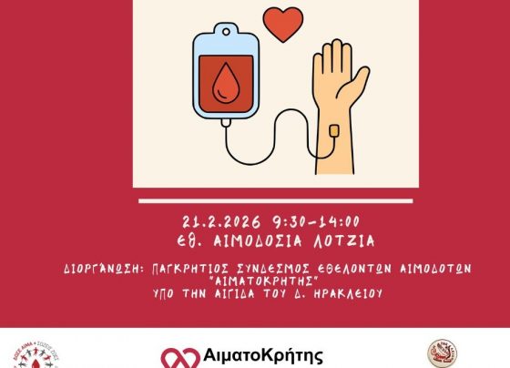 Σήμερα Σάββατο 21 Φεβρουαρίου 2026 θα πραγματοποιηθεί εθελοντική αιμοδοσία στο κέντρο της πόλης του Ηρακλείου και συγκεκριμένα στο αίθριο της…